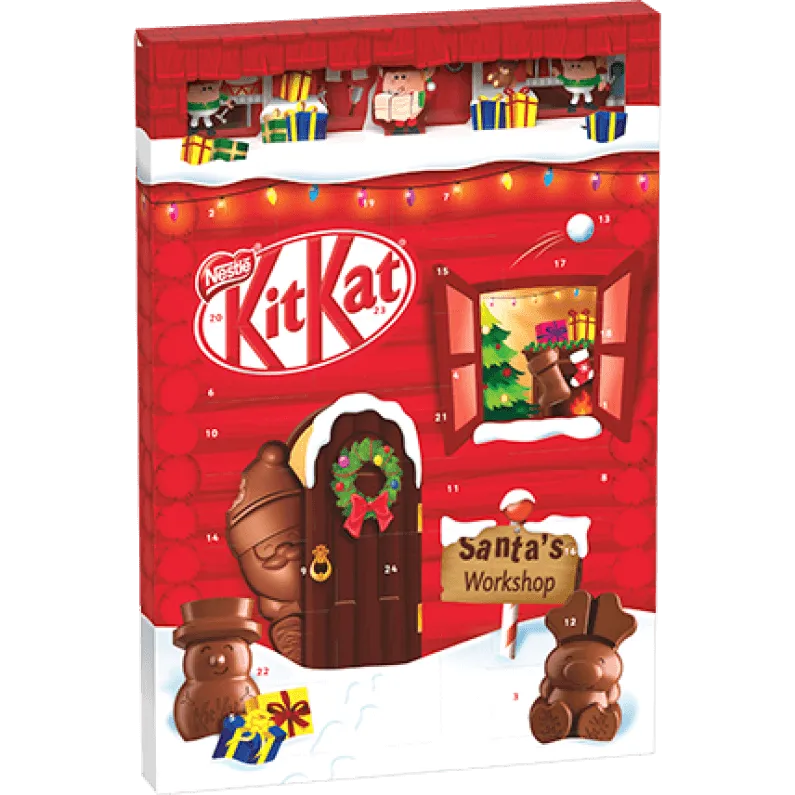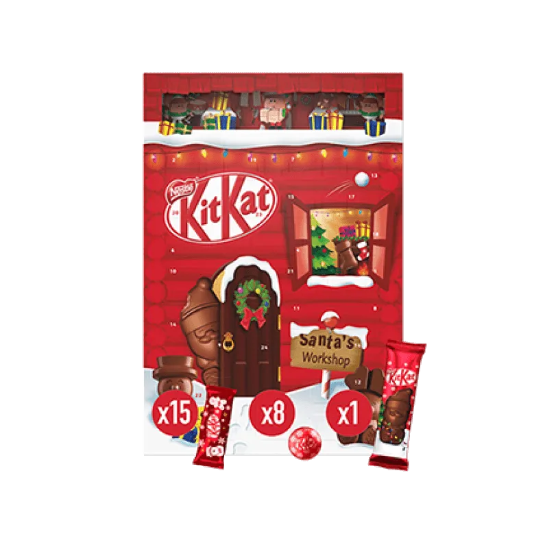 Κάντε την αντίστροφη μέτρηση για τα Χριστούγεννα απολαυστικά διασκεδαστική με το Χριστουγεννιάτικο Ημερολόγιο NESTLE KITKAT. Ενθουσιάστε τα παιδιά για το ποια σοκολατένια λιχουδιά θα βρουν πίσω από κάθε παράθυρο, με 15 ξεχωριστά τυλιγμένους χριστουγεννιάτικους χαρακτήρες από πιγκουίνους μέχρι ταράνδους, 8 στολίδια και έναν γευστικό Άγιο Βασίλη για την παραμονή των Χριστουγέννων! Ένα απαλό κέλυφος από σοκολάτα γάλακτος καλύπτει ένα πλούσιο σοκολατένιο κέντρο με τραγανά κομμάτια γκοφρέτας KITKAT για το τέλειο χριστουγεννιάτικο διάλειμμα. Η εμβληματική γεύση και υφή της KITKAT σε μια διασκεδαστική, γιορτινή μορφή για να ξεκινήσετε την περίοδο των γιορτών.